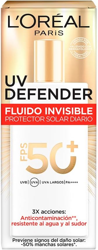 El L’Oréal UV Defender FPS50 es un protector solar facial de textura ligera diseñado para proteger la piel contra los rayos UV mientras ayuda a prevenir manchas y signos de envejecimiento.